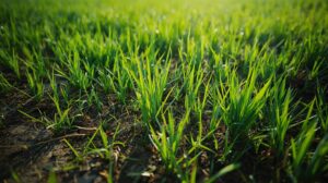 3月の春。田園。草木が生い茂り、土の中に草根がある