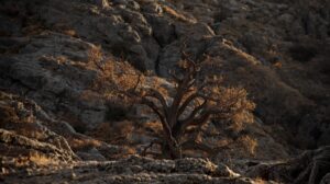 季節は秋。岩場にある大木の画像。枯れている