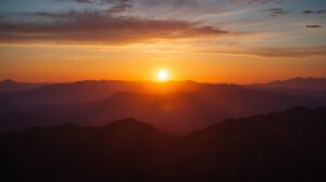山岳へ沈んでゆく黄昏時の太陽の画像