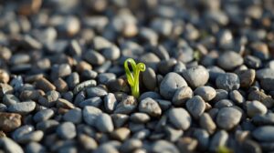たくさんの小石が敷き詰められた地面に、芽が這い出れない、石を押し上げられない芽が丸まった画像。季節は春